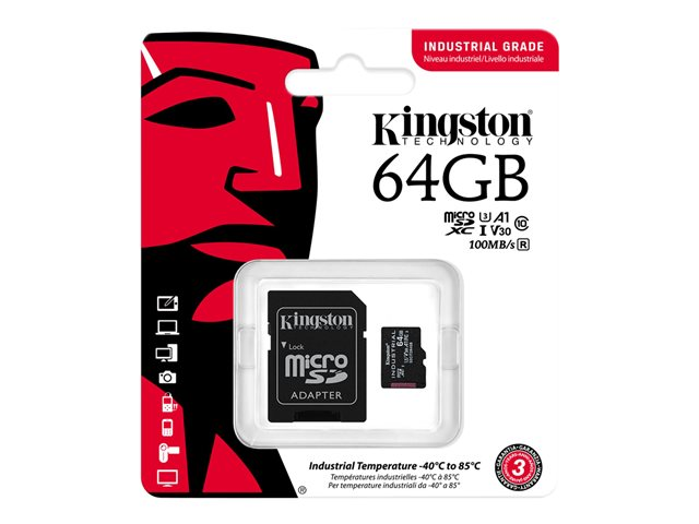Kingston Industrial - Flash-minneskort (microSDXC till SD-adapter inkluderad) - 64 GB - A1 / Video Class V30 / UHS-I U3 / Class10 - mikroSDXC UHS-I