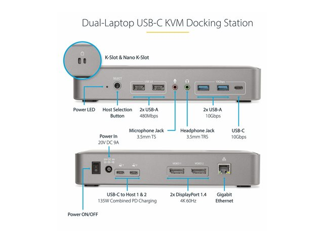 StarTech.com Dual-Laptop USB-C KVM Docking Station, Dual Monitor 4K 60Hz DisplayPort Dock, 5-Port USB Hub, GbE, 90W/45W Power Delivery to Two Laptops, Windows/Mac, 2-Host KVM Dock - dockningsstation - USB-C 3.2 Gen 2 - 2 x DP - 1GbE - TAA-kompatibel